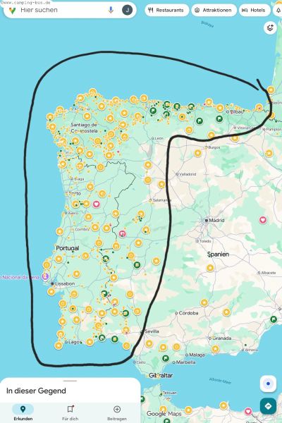 10./11.01. Lekeitio - Alaejos 384 kmWie geht unsere Reise weiter - nach Westen oder nach Süden? Diese Frage stellt sich bei unseren Reisen immer an der spanischen Nordküste. Natürlich ist es in der Regel sinnvoll, im Winter zuerst in den südlichsten Bereich zu fahren. Da scheint die Sonne am längsten und meistens regnet es dort am wenigsten. Von da geht es dann langsam nach Norden. Aber es kann auch mal andersrum klappen: Ungewöhnlich sonniges Wetter kündigten die Langfristprognosen bei unserer Reise 2021/ 2022 für den Norden an und genau so kam es. Deshalb waren wir von Ende Dezember bis Anfang Februar zunächst zwischen dem Baskenland und der Westküste Galiciens unterwegs. Hier der Reisebericht incl. Karte: Dieser Screenshot zeigt die geplante Region unserer Überwinterung: