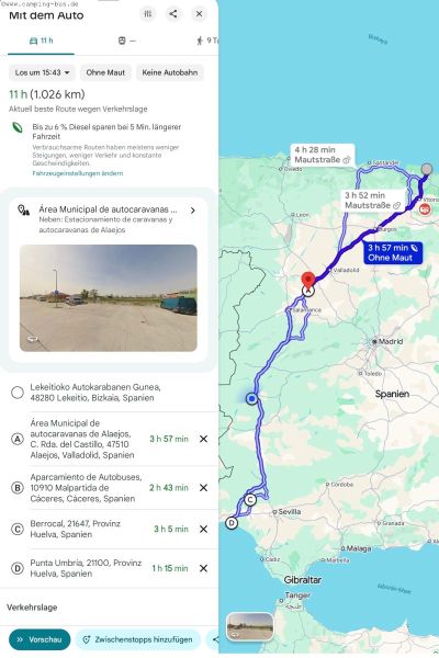 Mit dem Wohnmobil von der Küste des Baskenlands quer durch Spanien an die Küste AndalusiensTeil 2 von x: Überwintern mit dem Wohnmobil in Spanien und Portugal im Winter 2025/2026 Aufgrund der Wetterprognose fahren wir von der spanischen Nordküste im Baskenland an die Atlantikküste im Südwesten Andalusiens. Wir verbringen zwei Tage im sehr interessanten und sehenswerten Naturpark Los Barruecos. Dann stehen uns die schwersten Tage bevor, die wir jemals auf einer Reise erlebt haben - wir müssen uns für immer von unserer Hündin Bella verabschieden. Auf einem Parkplatz bei Ayamonte bleiben wir drei Tage bei überwiegend sonnigem Wetter am Strand.