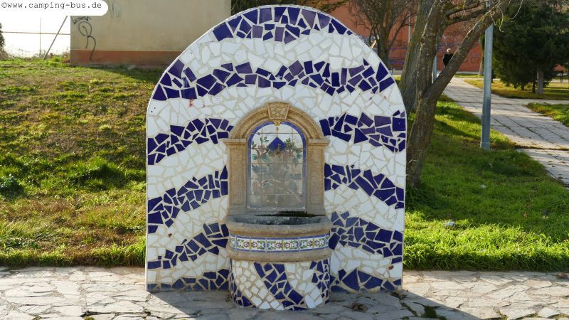 Der Wasserhahn der V&E befindet sich direkt neben dem Toilettenausguss. Aus hygienischen Gründen füllen wir unseren Tank deshalb auf der anderen Seite des Stellplatzes an diesem schönen Brunnen.