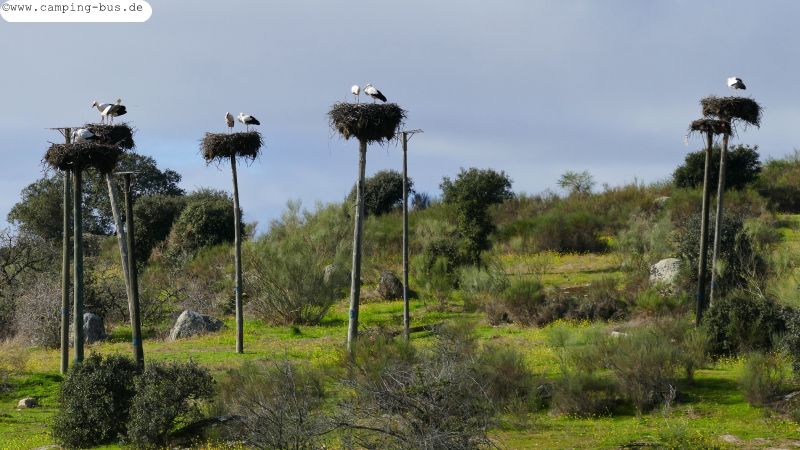 Auf den höheren Felsen gibt es viele Nester von und mit Weißstörchen.