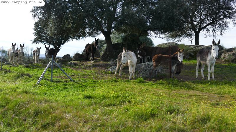 Hinter dem Zaun an unserem Parkplatz bevorzugen zwei Esel Steineichen statt frisches Grün unter ihren Hufen. Als ich an den Zaun komme ist es aber wichtiger, gekrault zu werden als zu fressen :-)