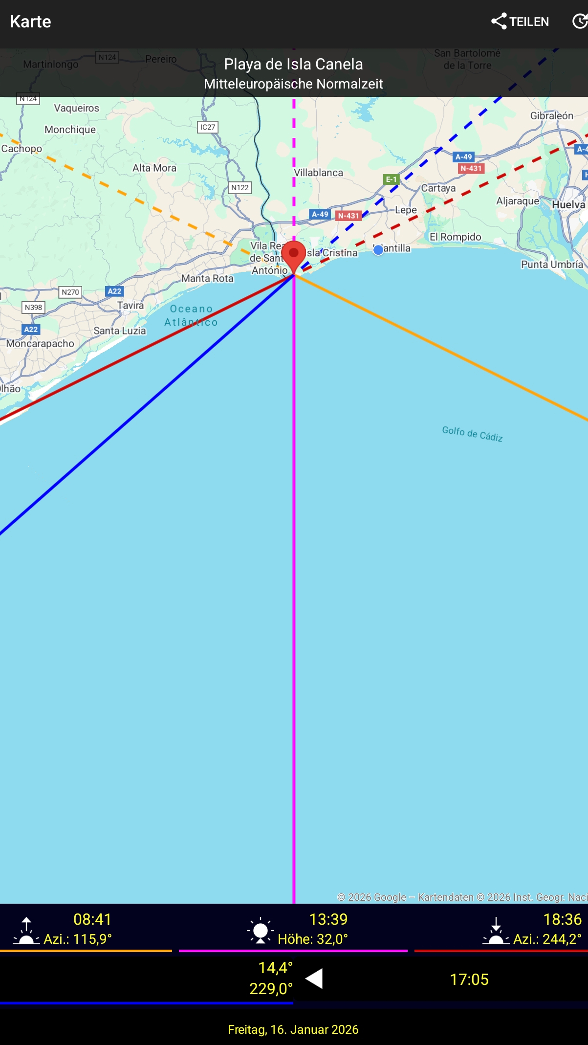 Es wundert uns immer wieder, dass hier im Winter an der westlichen Costa de la Luz Andalusiens fast alle touristischen Einrichtungen geschlossen haben im Gegensatz zu denen an der Algarve auf der anderen Seite der Grenze. Strandwanderer gibt es hier kaum, stattdessen Muschelsucher und Angler zu allen Tages- und Nachtzeiten. Wegen denen verzichten wir auch auf die freien Parkplätze in der ersten Reihe. Die Sicht auf Wellen und Meer ist so gut genug.