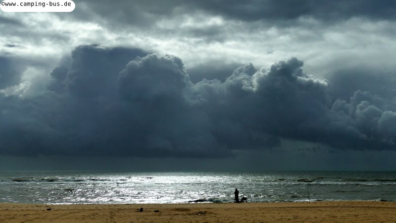 25. bis 28.01. La Palma del Condado - Islantilla 84 kmSeit Beginn unserer Reise haben wir ja unglaublich Glück mit dem Wetter gehabt. Aus allen Regionen der iberischen Halbinsel erreichen uns seit Ende Dezember Meldungen über Regen und Sturm während wir ganz überwiegend von der Sonne verwöhnt werden. Das wird sich nun aber nach den Wetterprognosen auch bei uns für die nächsten Tage ändern. Wir versuchen, windgeschützte Plätze mit festem Untergrund zu finden und fahren Sonntag wieder auf den Strandparkplatz Islantilla, auf dem wir bereits vor einer Woche waren. Dramatische Wolken über dem glänzenden Meer empfangen uns hier.