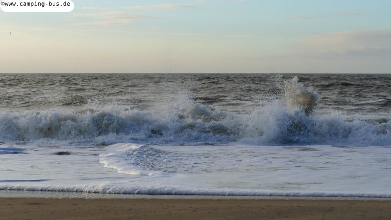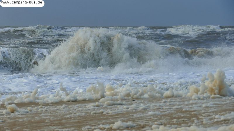 Der Wind bläst aus West-Südwest und trifft nicht frontal auf die Küstenlinie - man sieht, die Wellen kommen von der Seite. Ansonsten würden Wasser und Wellen sicher erheblich höher steigen.