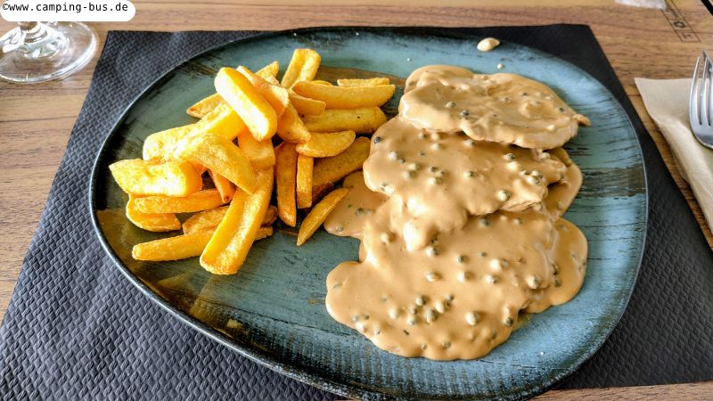 Nicht typisch italienisch aber auch hervorragend: Schweinefilet mit Pfeffersauce, Salat und richtig knackigen Pommes.