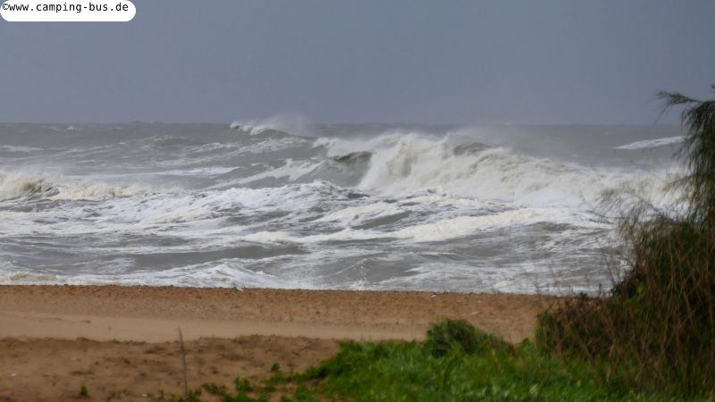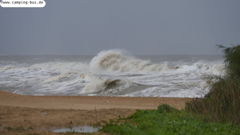 Vom Sturm am Dienstagmorgen bekommen wir nichts mit außer dem tobenden Meer beim Blick aus dem Fenster im Morgengrauen.