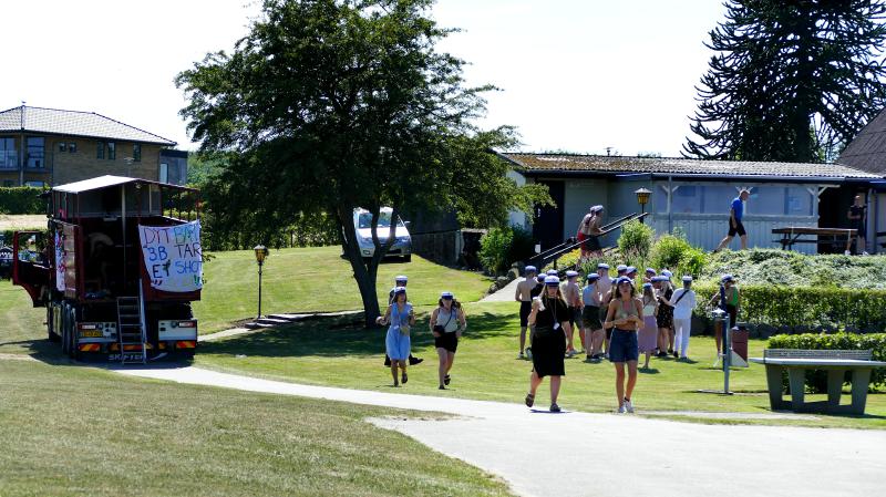 ... und auf der Straße: Hier fahren laut hupend und mit Musik zwei Wagen mit Schülern auf und ab. "Die feiern den Schulabschluss eine ganze Woche ab Montag.", hatte Jens vom Lillebælt Camping uns erzählt. Tatsächlich, heute ist der 7. Tag! Am Abend erscheinen noch einige Schulabsolventen mit ihren Mützen zunächst auf dem Badesteg und später direkt vor uns am Strand. Davon gibt es keine Fotos, die zur Veröffentlichung geeignet sind :-).
