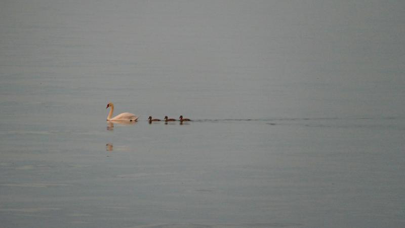 Familie Schwan sehen wir zu verschiedenen Zeiten, mal schwimmend, mal schnabulierend am Ufer.