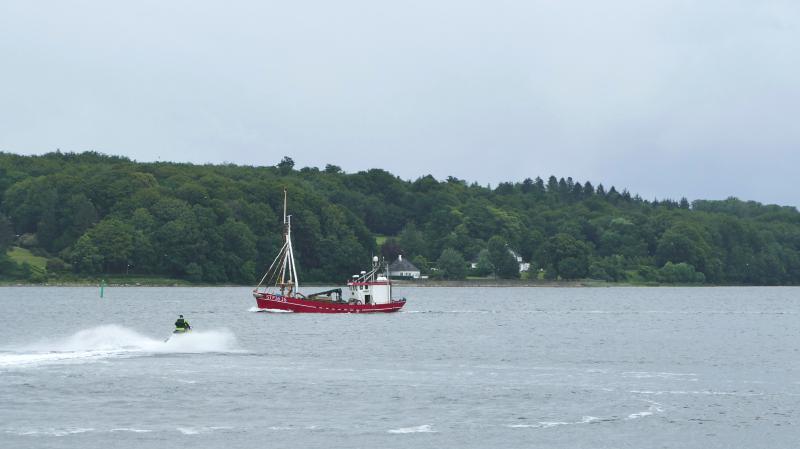 Aus den Seitenfenstern schauen wir auf die Apenrader Förde. Das ist besonders interessant, denn hier herrscht reger Betrieb.