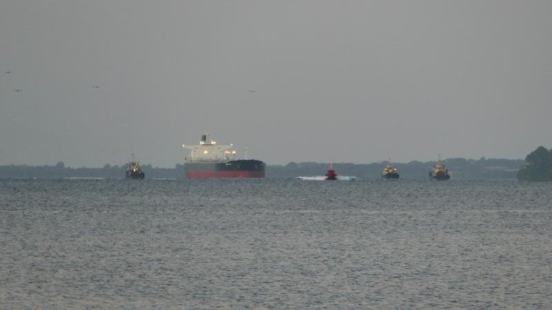 Am spannendsten wird es gegen 22 Uhr. Der Tanker Sea Puma (250 m x 44m) wird von drei Schleppern und dem Lotsenboot in Empfang genommen.