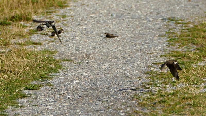 Eine Schwalbe nimmt ein Staubbad auf dem Schotterweg.