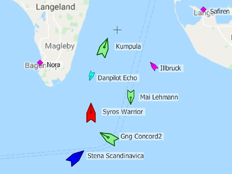 Viel Verkehr im Langelandbelt zwischen Langeland und Lolland, wie die Fotos und der Screenshot der Marine-Traffic-App zeigen.