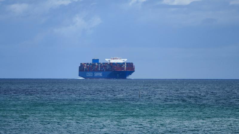 Als wir die Ostküste erreichen, nähert sich gerade ein Containerfrachter der 400 m - Klasse, die Cosco Shipping Star. Solch einen "dicken Pott" haben wir bisher auf dieser Reise noch nicht gesehen.