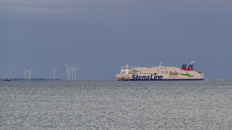 Kurz nach Sonnenuntergang fährt die Stena Line auf dem Weg von Kiel nach Göteborg vorbei.