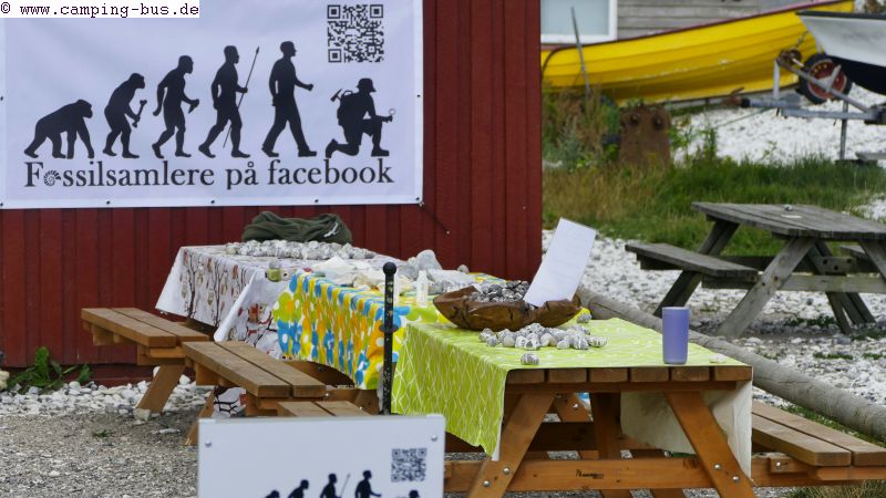 Bei unserer Ankunft steht eine Gruppe Menschen um einen Tisch mit Fossilien.