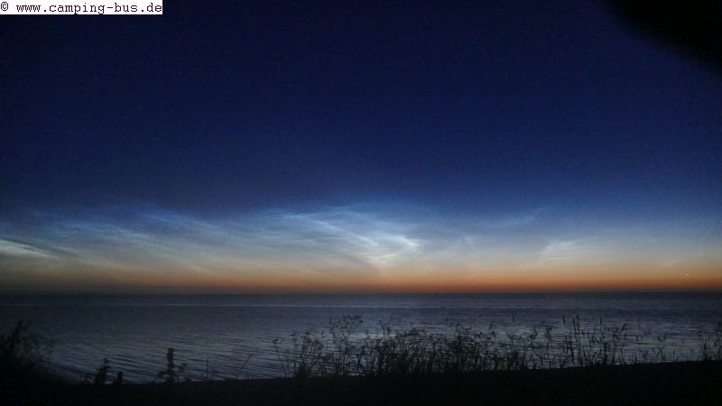 Leuchtende Nachtwolken über fünf Stunden nonstop!Hier gibt´s die Erklärung auf Wikipedia zu Leuchtenden Nachtwolken. Im Zeitraffervideo erfolgt die Wiedergabe mit 12,5 Bildern pro Sekunde, die Aufnahmen machte die Kamera automatisch im Abstand von 30 Sekunden. Hier mein Zeitraffervideo auf Youtube. Sonnenuntergang: 21:35 Uhr, Echte Mitternacht: 01:23 Uhr, Sonne 15,0 Grad unter Horizont, Sonnenaufgang: 05:12 Uhr Gegen 22:45 Uhr werden sie schwach sichtbar und dann schnell heller. 23:10 Uhr
