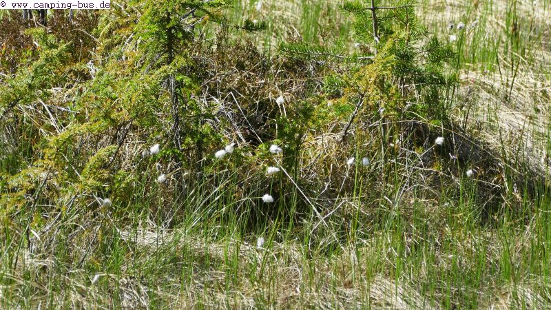 Zum ersten Mal auf dieser Reise sehen wir eine Sumpflandschaft mit blühendem Wollgras.