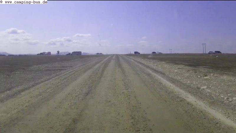 Etwas Staub ist bei trockenen Schotterstraßen ja normal. Aber auf dem Holzweg trifft es uns doch stärker als gewöhnlich, hier der Blick zurück aus dem Heckfenster.