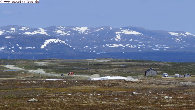 Rechts und links der Straße parken am Flatruet-Pass Kurzzeitbesucher und Wohnmobile.