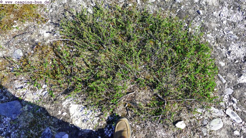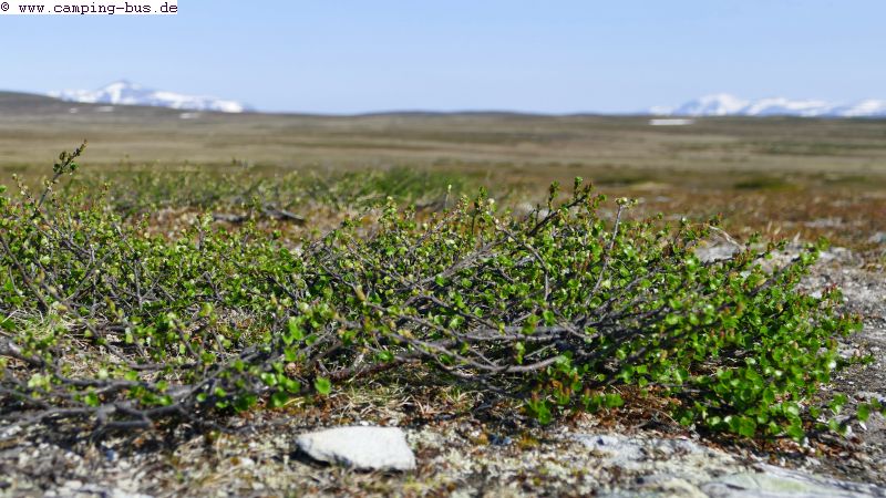 Hier gibt´s auf über 900 m über NN arktische Vegetation, obwohl wir uns in der südlichen Hälfte Schwedens befinden. Auch deshalb lieben wir diese Hochebene seit unserer ersten Wohnmobilreise durch Skandinavien. Die Zwergbirken kriechen über den Boden statt aufrecht zu stehen.