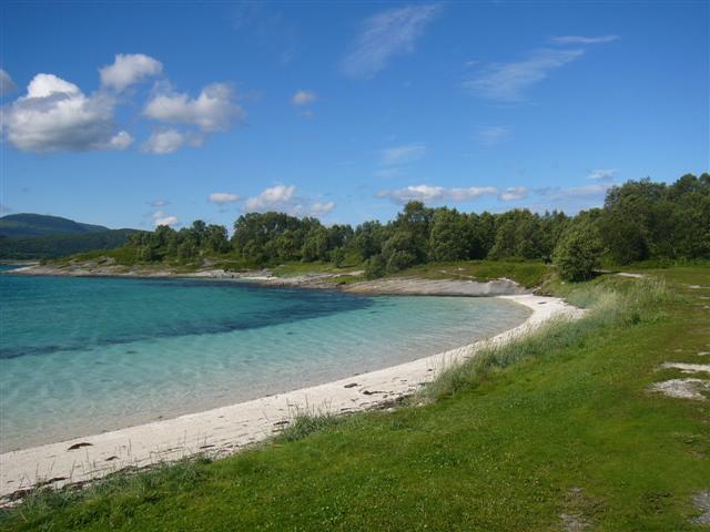 ... und lecken die Asche auf. Es werden immer mehr, sie schubsen sich zur Seite, stoßen an unserem Campingbus, verstellen dabei mit ihrem Hintern den Spiegel und lassen sich auch durch das Bellen von Julie nicht vertreiben. 19.07.2011 Aunfjellet - Harstadt - Gressholmen - Sandstrand - Evenes 100 kmNach einigen Regentropfen am Morgen verschwinden am nächsten Tag die Wolken und wir wollen uns für die letzte Nacht in Norwegen einen schönen Mitternachtssonnenplatz suchen. Das wird in dieser Region schwierig, denn einen Blick aufs offene Meer gibt es kaum noch. Zunächst machen wir einen Abstecher nach Harstad und fahren auf den Platz am Kulturhus (WOMO-Führer Platz 132). Laut WOMO-Führer dürfen in Harstad ausländische Fahrzeuge kostenlos parken. Dies gilt offenbar nicht mehr, denn weder im Prospekt der Touristeninformation noch an den Parkplätzen gibt es entsprechenden Hinweise. Hier könnte man übernachten und am nächsten Morgen gegen 8 Uhr die Hurtigruten-Schiffe sehen, die auf dem Weg nach Norden und Süden fast gleichzeitig in Harstad anlegen. Aber wir hoffen ja auf einen Platz mit freiem Blick nach Norden und fahren zur nächsten Empfehlung, ... ... dem Bade- und Picknickplatz Gressholmen (134). Ein schöner menschenleerer Strand mit Liegeweise bei idealem Sommerwetter - warum ist hier kein Mensch??? Uns gefällt der Parkplatz allerdings nicht als Übernachtungsplatz, zumal man aus dem Womo keinen freien Blick nach Norden hätte sondern auf den Damm gehen müsste, der zum Gressholmen-Inselchen führt.