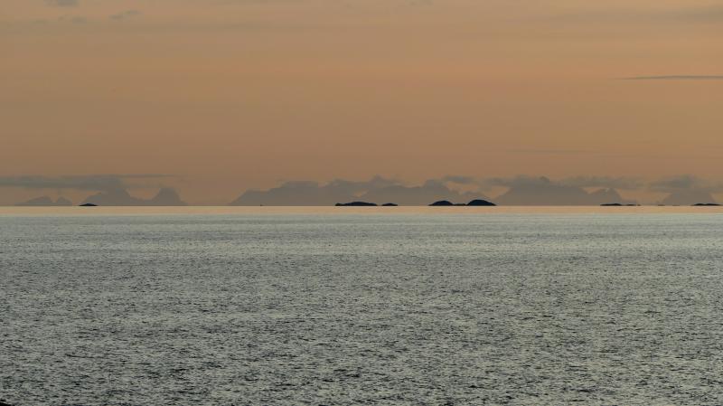Ganz weit in der Ferne sehen wir die Berge des südwestlichsten Teils der Lofoten.