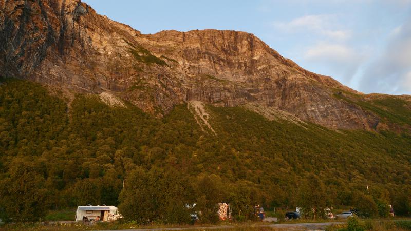 Wichtiger Hinweis: Der Platz ist manchmal für Festivalbesucher reserviert! Eins war am 5. und 6. Juli 2019, das nächste wird für den 25. bis 28. Juli angekündigt. Also möglichst vor der Anfahrt "Festival Langsanden Sandhornøya" googeln, ob der Platz frei ist! Im Laufe des Tages füllt sich der Parkplatz mit Campingfahrzeugen aller Art. Die tiefstehende Sonne färbt die Felswand hinter uns.