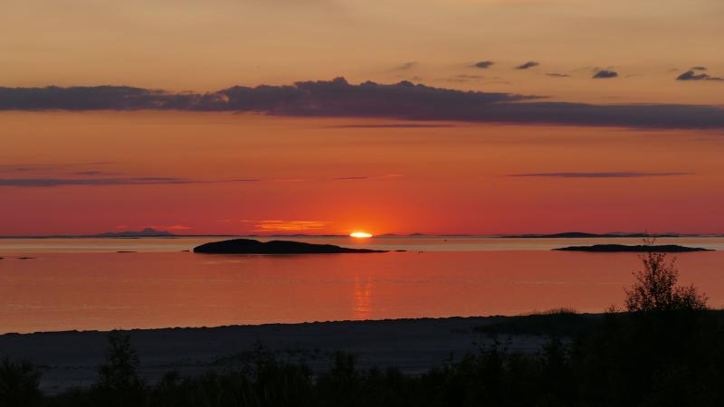 Hier an unserem Standort geht inzwischen die Sonne wieder unter, der Polartag ist vorbei! Vom Sonnenaufgang am 31. Mai um 01:22 Uhr bis zum Sonnenuntergang am 13. Juli um 00:58 Uhr ist sie hier nicht mehr unter dem Horizont verschwunden. Aber nun nimmt die Tageslänge ständig drastisch ab, am 19. Juli sind es nur noch knapp 22 ½ Stunden. Sehr langsam versinkt die Sonne hinter den Lofoten. Schaut mal, wie weit die Sonne während des Untergangs noch über den Horizont gewandert ist! Zwanzig Minuten liegen zwischen dem ersten und dem dritten Foto dieser Serie! 23:44 Uhr