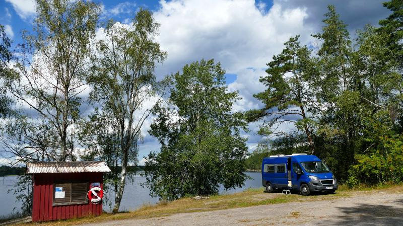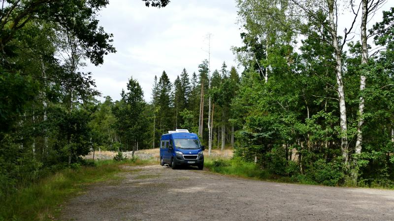 03./04.08. Kalundborg / Dänemark - Öresundbrücke - Flammafallet / SchwedenVöllig abseits der geplanten Route bleiben wir am Dienstag auf dem Parkplatz am Flammafallet. Einige Zeit nach der so glatten Einreise nach Schweden meldet uns Google Maps zunächst einen Unfall und dann eine Vollsperrung der E 20 zwischen Halmstad und Göteborg. Die zusätzliche Fahrzeit erhöht sich rasch um über eine Stunde und erst am späten Nachmittag normalisiert sich die Lage. Der Umweg über den Flammafallet östlich von Halmstad dauert zwar noch länger, die Fahrt durch die Wälder und der Spaziergang zum Wasserfall sind aber schöner als eine Stunde im Stau auf und neben der Autobahn.