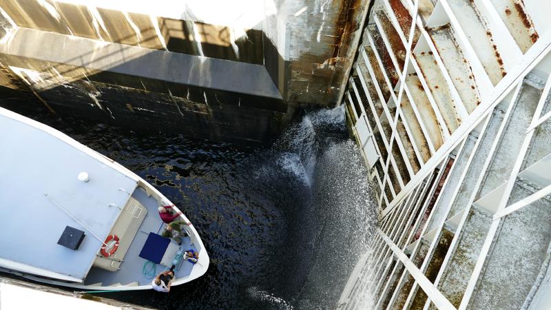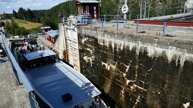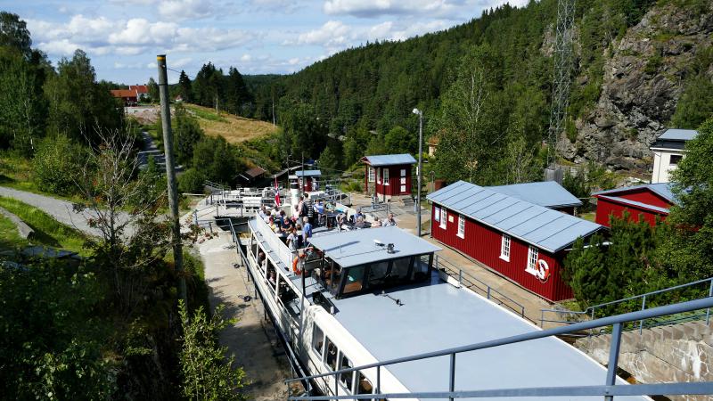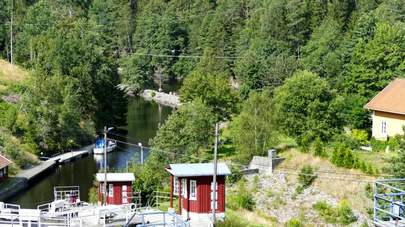 05. bis 07.08. Kornsjön - Nössemark / Schweden - Haldenkanal / Norwegen - Brekke-Schleuse - (Strømsfoss) 103 kmÜber den Grenzübergang Nössemark - Aremark reisen wir am Donnerstag nach Norwegen ein. Wir sind die einzigen Grenzgänger zu diesem Zeitpunkt. Also gibt es keine Wartezeit sondern nur einige Minuten Unterhaltung mit einem sehr netten Polizisten. Er spricht perfekt Deutsch, hat es 5 Jahre in der Schule gelernt, seine Mutter war Deutschlehrerin und er hat einige Freunde in Deutschland. Während des Gesprächs über unsere Reiseziele in Norwegen und andere Themen kontrolliert er unseren digitalen Impfausweis. Unser erstes Ziel ist die Brekke-Schleuse im norwegischen Haldenkanal, mit 27 Metern Höhenunterschied die höchste Schleusenanlage Nordeuropas. Die Schleusung der MS Brekke, die wir hier miterleben, dauert insgesamt 40 Minuten.