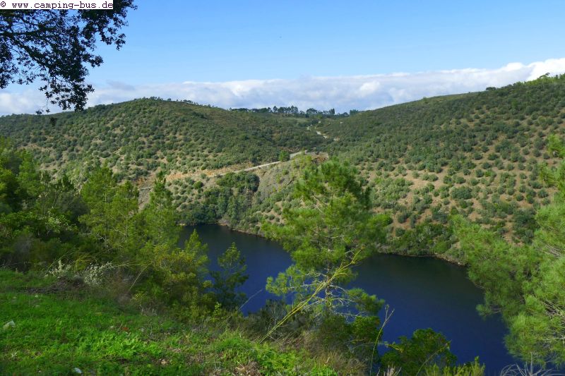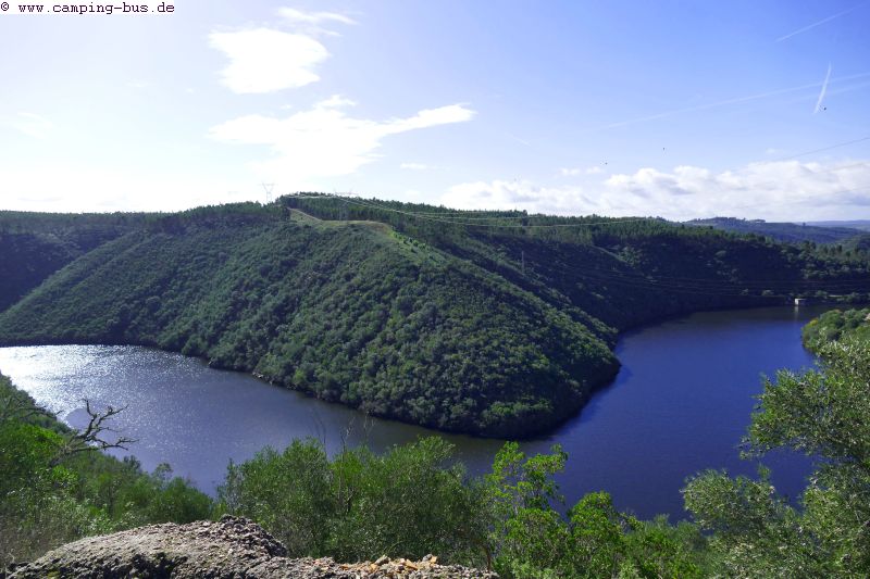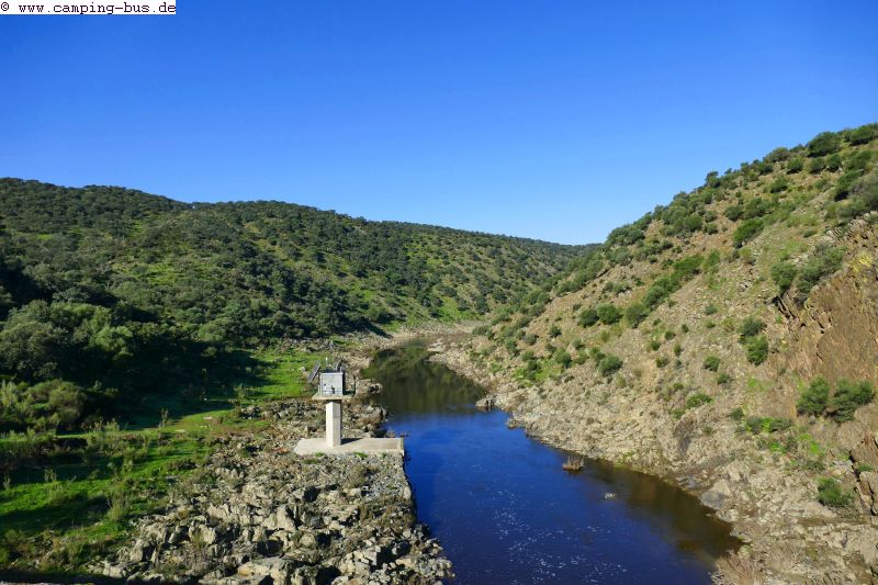 Überquert man die Straße, schaut man über das Tal des Río Sever westwärts nach Portugal. Der bildet hier die Grenze zwischen Spanien und Portugal und mündet an der Staumauer in den Tajo.