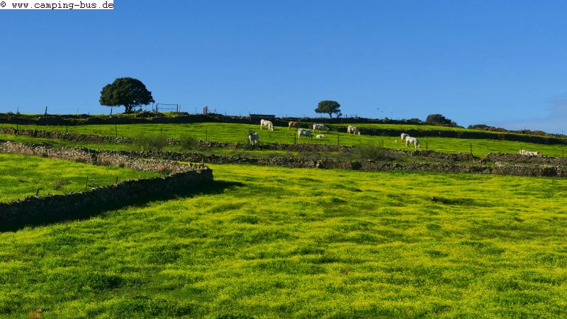 Nur schwach zu erkennen ist die Bergstadt Marvão. Zwischen dem Stausee von Cedillo und Valencia de Alcántara gibt es keine öffentliche Straße an die Grenze bzw. in das Tal des Río Sever. Die ganze Landschaft ist eingezäunt und dient Kühen, Schafen und Schweinen als Weide.