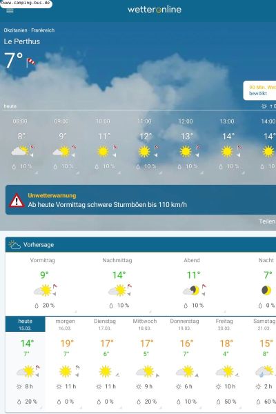 14. bis 16.03. La Vajol - Castellfollit de la Roca 66 kmDen ersten Anlauf nach Castellfollit de la Roca hatten wir wegen einer Unwetterwarnung am 4. März abgebrochen, siehe Teil 12 unseres Reiseberichtes. Jetzt wollen wir eigentlich von La Vajol zum Fort de Bellegarde bei Le Perthus auf die französische Seite der Grenze. Aber nun kommt die nächste Unwetterwarnung für die Nordseite - Böen bis 110 km/h!