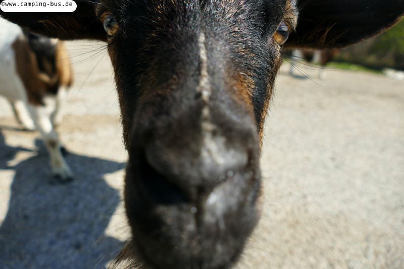 Eine Herausforderung ist es immer, Ziegen auf Augenhöhe zu fotografieren. Sobald man die Kamera in der richtigen Höhe hält, sausen sie drauf los. Zieht man sie nicht schnell genug zurück, hat man einen Fleck auf dem Objektiv.