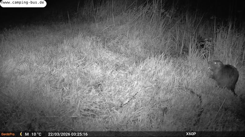 In der wasserreichen Region fühlen sich neben vielen Vögeln auch Nutrias und Bisamratten wohl. Gleich nach unserer Ankunft am Rhône-Sète-Kanal finden wir schmale und etwas breitere "Wege" am Schilf zwischen den Gewässern. Am breiten Pfad erscheint in der Nacht zunächst ganz vorsichtig ein Nutria und inspiziert das ungewohnte Gerät neben seinem Weg.