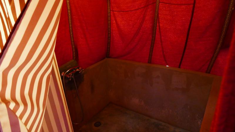 Toilette, Waschbecken und Dusche. Es gibt zur Wasserversorgung eine Pumpe und einen kleinen Wasserturm. Vernünftigerweise duschen die meisten Gäste laut Moha nicht hier, sondern nach der Rückkehr im Hotel!