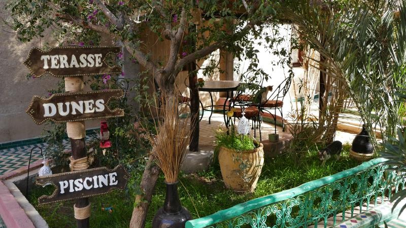 Moha ist selbst manchmal "auf großer Fahrt" mit Touristen in Marokko unterwegs für seine zweite Firma "Best of Merzouga - Sahara Tours". Das komplette Angebot gibt es hier auf seiner Website www.bestofmerzouga.com. Hinter der Rezeption folgt ein weiterer Innenhof mit Springbrunnen, Palmen und Sitzecken.