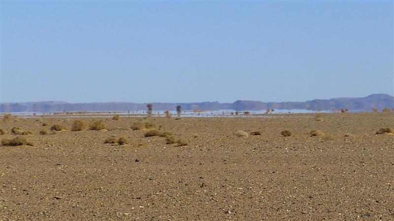 Beim Blick nach Osten sieht man die karge Wüstenvegetation - und einen See mit Bäumen am Ufer? Nein, die Gewächse sind echt aber der See ist ein See ohne Wasser, eine Luftspiegelung, eine FATA MORGANA.