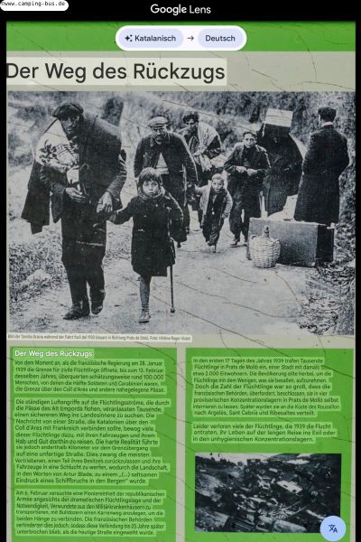 Für ihn und alle anderen Flüchtlinge wurden nach dem Ende der Franco-Diktatur ab 1975 an der Grenze mehrere Denkmäler aufgestellt. Dies am Coll de Manrella entstand 1981 und wurde von der spanischen Seite durch eine Straße erschlossen. Weitere Denkmäler und Erinnerungstafeln gibt es unter anderem in La Vajol, einem Versteck vieler Franco-Gegner. Von hier brachen sie auf in die erhoffte Freiheit nach Frankreich, so wie der katalanische Politiker Lluís Companys i Jover. Nun kommt leider die deutsche Geschichte ins Spiel: Nach der Besetzung Frankreichs wurde er durch die Gestapo verhaftet, an Spanien ausgeliefert und durch die Franco-Diktatur zum Tode verurteilt und erschossen.