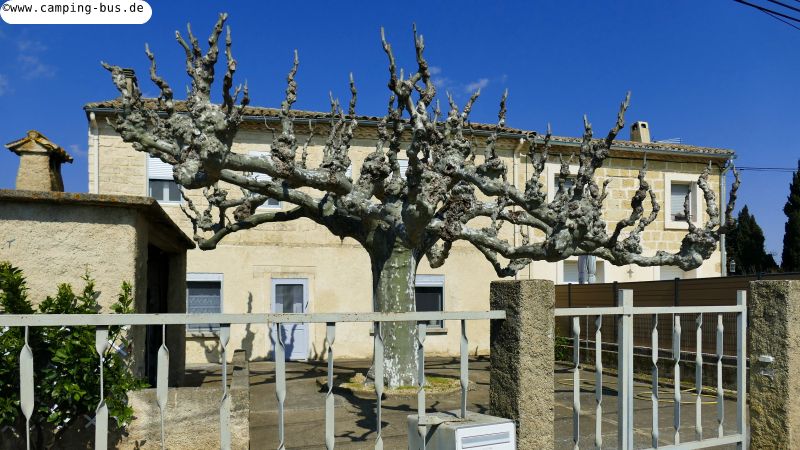 In der Nähe fällt uns eine alte kunstvoll geschnittene Platane auf.