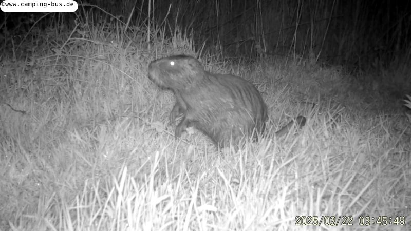 In der wasserreichen Region fühlen sich neben vielen Vögeln auch Nutrias und Bisamratten wohl. Gleich nach unserer Ankunft am Rhône-Sète-Kanal finden wir schmale und etwas breitere "Wege" am Schilf zwischen den Gewässern. Am breiten Pfad erscheint in der Nacht zunächst ganz vorsichtig ein Nutria und inspiziert das ungewohnte Gerät neben seinem Weg.