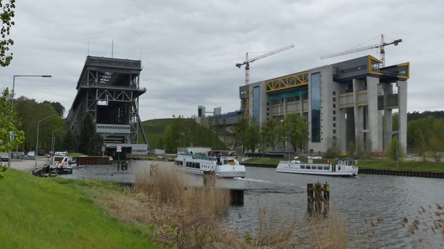 Als nächstes stehen die Schiffshebewerke bei Niederfinow auf unserem Reiseplan. Auf dem folgenden Bild seht ihr links das älteste noch betriebene Schiffshebewerk Deutschlands von 1934, rechts die Baustelle des neuen.