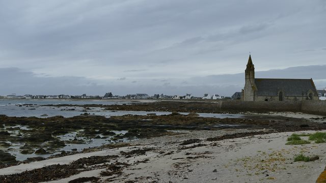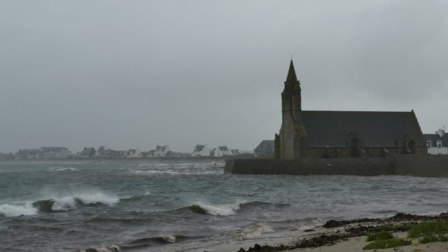 ... und die Kirche Notre-Dame-De-La-Joie. Hier vom Parkplatz an der Kirche beobachten wir den Gezeiten- und Wetterwechsel im Laufe des Tages.