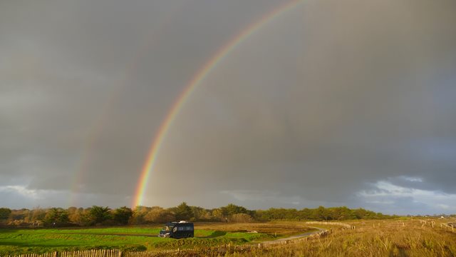 Dies Bild zeigt den Blick Richtung Meer mit einem Regenbogen aus dem windgeschützten hintersten Winkel vom Wohnmobil aus.