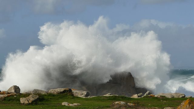 Meer, Gischt, Wolken, Felsen - die letzten Sekunden einer Welle in Saint Guénolé.
