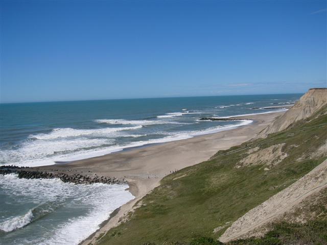 An den Strand führt eine massive Treppe den Steilhang hinab.
