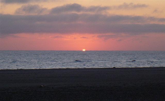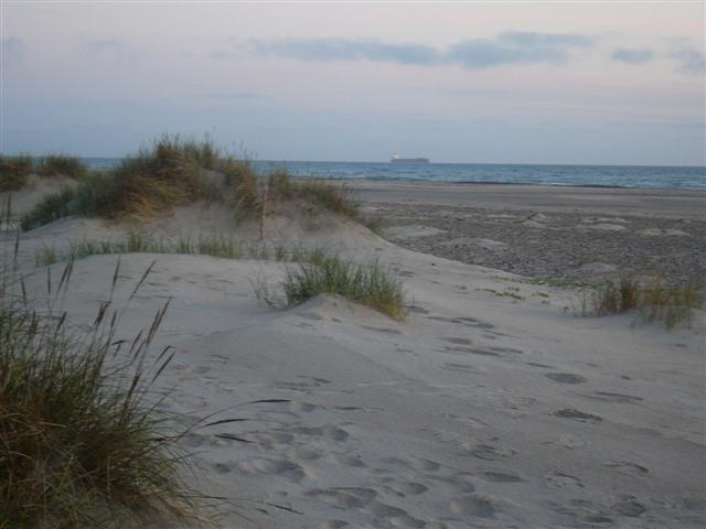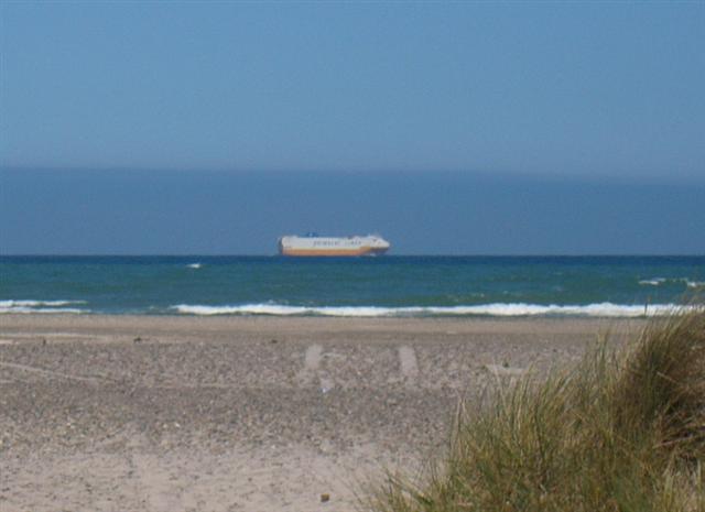 Reisebericht Teil 6 von 10: Mit dem Wohnmobil durch Schleswig-Holstein und Dänemark im Juni/Juli 2010Zwischen Skagerak und Kattegat - Wellen und Schiffe gucken am Übergang von Nordsee und OstseeAm nächsten Morgen stehe ich gegen 4 Uhr am Strand in Erwartung des Sonnenaufganges. Das Licht kurz vorher ist ganz anders als am Abend kurz nach Sonnenuntergang. Am 22.06.2010 um 4:15 Uhr kommt sie wieder aus dem Meer hervor, glücklicherweise wird sie nicht von Wolken verdeckt. Nur das Schiff lässt sie für einen Moment wieder unsichtbar werden - wie auf die Minute bestellt fährt es vorbei. Nach ca. 10 Minuten ist das für mich ungewöhnliche Schauspiel vorbei und ich gehe wieder ins Bett im Wohnmobil, bevor Strandspaziergang und Schiffe gucken den weiteren Tagesablauf bestimmen. Heute bleibt es überwiegend bewölkt, aber die Sicht auf Nordsee und Ostsee ist gut.
