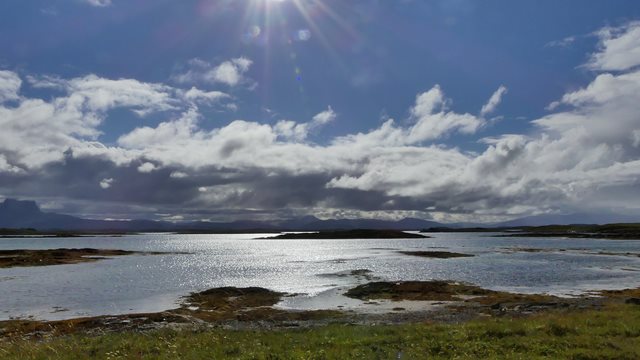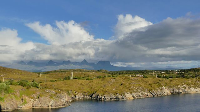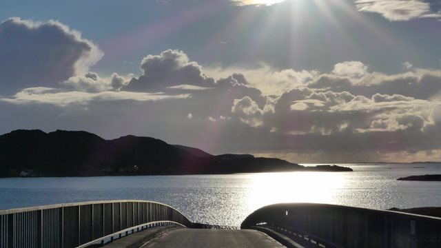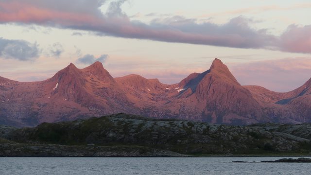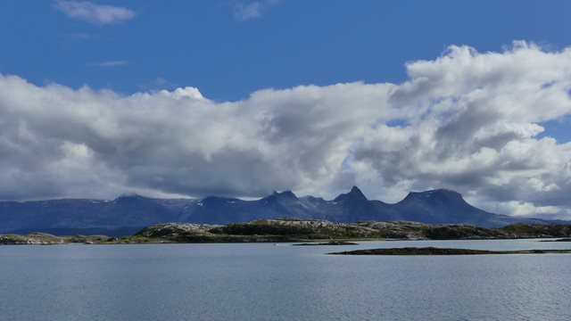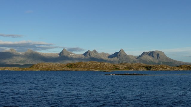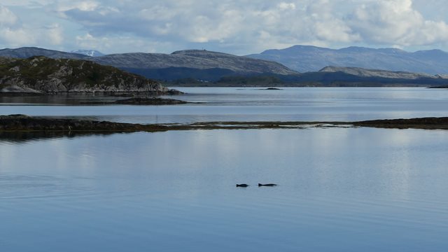 Die Sieben Schwestern, ein dreiköpfiges See-Ungeheuer und anderes Getier - auf den 5.158 Inseln von Dønna und HerøyTeil 14 von 18: Mit dem Wohnmobil durch Lappland 16.06. bis 07.09.2016 Zwei Gemeinden mit 5.158 Inseln - ist das rekordverdächtig? Die Berg- und Schäreninseln vor der Küste von Helgeland sind ein ganz ungewöhnliches Stück Norwegen. Wir bleiben drei Tage in Dønna und Herøy, haben immer die Sieben Schwestern im Blick, erschrecken über ein dreiköpfiges See-Ungeheuer und sehen verschiedene Tiere zu Wasser und in der Luft. Leirbotn - Sandnessjoen - Dønna - Herøy und Die Sieben Schwestern 10.08. bis 13.08.201610./11.08. Leirbotn - Sandnessjoen - Dønna - Dønnesfjellstua - Herøy/ Hoholmenbru 123 kmAm Mittwoch nehmen wir die Fähre von Sandnessjoen nach Dønna und kommen an unserem "Stellplatz" der letzten Tage vorbei. Nun liegt er wieder verlassen vor der Helgelandbrücke und wartet auf die nächsten Angler oder mobilen Übernachtungsgäste. Bei der Überfahrt kreuzen wir das Hurtigruten-Schiff Nordnorge auf dem Weg nach Süden. Auf Dønna werden wir kurz nach der Ankunft von blühenden Kartoffelfeldern überrascht. Dann geht es hoch hinauf zur Dønnesfjellstua auf 127 m über NN. Leider öffnet die Dønnesfjellstua erst um 14 Uhr, solange wollen wir nicht warten. Einen phantastischen Rundumblick bietet dieses Berggasthaus, u.a. auf Lovund ... ... und Træna (links vom großen Felsenberg) weit draußen im Nordmeer. Auf den Bildern sieht man einige der flachen Felsinseln des Archipels der Kommunen Dønna und Herøy. 5.158 Inseln sollen zu den beiden Gemeinden gehören, siehe Website http://utioyan.no/om-ut-i-oyan/?lang=en Ob man da jeden noch so winzigen Felsen als Insel gezählt hat? In Dønnes halten wir kurz an der Kirche aus dem 12. Jahrhundert und begeben uns auf die Suche nach einem Übernachtungsplatz. Es gibt viele kleine Sandstrände auf den Inseln aber kaum einer ist mit dem Campingbus erreichbar. Als wir aufgrund einer Empfehlung einen schönen Strand mit Parkplätzen finden stellen wir fest: Direkt neben dem Strand steht ein hoher Berg. Auch wenn der Himmel wolkenlos wäre würde die Sonne erst gegen Mittag hier erscheinen. Wir fahren weiter nach Herøy zum Campingplatz. Der gefällt uns aber aus verschiedenen Gründen garnicht. Auf dem Weg dorthin haben wir schon einige Brücken überquert mit denen die bewohnten Inseln des Archipels verbunden sind - hier sieht man zwei auf einen Blick. An der Hoholmen bru finden wir einen Parkplatz mit schöner Aussicht auf die höchsten Berge auf Dønna, die "Sieben Schwestern" bei Sandnessjoen und die flachen Schäreninseln. Führt die Brücke direkt ins Meer zum dreiköpfigen Herøy-Monster (siehe weiter unten)? Nein, zum Glück nicht. Aber es wirkt schon dramatisch wenn man vom Gipfel der Hoholmenbrücke gegen die Sonne abwärts schaut. Ansonsten sieht die flache Insellandschaft Herøys von hier oben doch "normaler" aus. Von hier sieht man die Sieben Schwestern, eine markante Gipfelformation auf der Insel Alsten südlich von Sandnessjoen. Sie wollen ihren Schleier nicht ganz lüften. 11. bis 13.08. Herøy/ Hoholmenbru - Tennvalen - Engan 39 kmNach der Nacht neben der Brücke fahren wir heute zunächst zum südlichen Ende der Straße auf der Insel Tennvalen. Es geht über weitere Bogenbrücken auf immer schmalere Inselchen ... ... mit kleinen Sandsträndchen. Nach Westen blickt man von hier aufs offene Nordmeer. Wir drehen um und folgen der Beschilderung nach Engan an der Ostküste. Mitten "in den Ort" mit etwa einem Dutzend Häusern führt einer der unzähligen Meeresarme - jetzt bei Niedrigwasser liegen die Boote fast auf dem Trocknen. Wir fahren noch etwa zweihundert Meter weiter um eine Kurve und das Ende der Straße ist erreicht. Hier gibt es nur noch einen Parkplatz an einem ehemaligen Fähranleger. Hier auf der Insel haben wir heute fast 100% Sonnenschein. Die Sieben Schwestern und das ganze Gebirge auf dem Festland bleiben überwiegend unter Wolken. Plötzlich ruft Gaby: "Da schwimmt was Unheimliches!" Wir laufen raus, ich schalte schon reflexartig die Kamera ein. Da kommt das dreiköpfige See-Ungeheuer. Drei Seeotter schwimmen direkt auf uns zu. Einer taucht links ab, die beiden anderen bleiben auf Kurs. Und was ist das jetzt für eine Nummer? Danach machen sie sich einen Moment unsichtbar. Plötzlich huschen die beiden direkt unter uns aus dem Wasser und verschwinden zwischen den Felsen. Ob wir sie morgen nochmal sehen können? Wir drehen uns um - und sehen "unser Monster" auf dem Esstisch am offenen Fenster. Was guckt ihr da? Warum darf ich nicht mit raus? Geduld zahlt sich aus - anders als erwartet! Wir bleiben einen weiteren Tag auf dem Parkplatz am ehemaligen Fähranleger von Engan, stellen den Stuhl über die Otterfelsen und warten. Zuerst erscheinen Kühe am Felsstrand, ... ... Wildgänse in der Luft ... ... und ein Schwarm winziger Fische vor uns im Wasser. Die Seeotter lassen sicht nicht blicken. Aber was schwimmt da? Zwei Schweinswale tauchen auf ... ... und schwimmen eine ganze Weile in unserer Nähe. Die Seeotter bleiben heute unsichtbar aber mit diesem Alternativangebot sind wir einverstanden :-). Bei fast wolkenlosem Himmel fallen die Wolken über den Bergen des Vega-Archipels im Süden besonders auf. Die Sieben Schwestern auf Alsten bei Sandnessjoen/ Helgeland im Laufe des TagesWenn doch die Sieben Schwestern uns gegenüber auf der Insel Alsten sich auch endlich mal so "oben ohne" zeigen würden. Aber so wie auf diesem Bild ist es ja auch schön mit der Spiegelung auf der ruhigen Wasseroberfläche. Einige Zeit später zeigt sich wieder ein anderes Bild. Auch hier gilt: Geduld bei der Beobachtung zahlt sich aus. Die Geduld fällt nicht schwer, wir müssen nur aus dem Fenster unseres Wohnmobils gucken - was für einen idealen Platz mit unverbaubarer Fernsicht haben wir hier entdeckt. Da stören uns die hier auf dem Parkplatz gelagerten Kabel überhaupt nicht. Ein einziges Fahrzeug kommt in den z