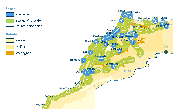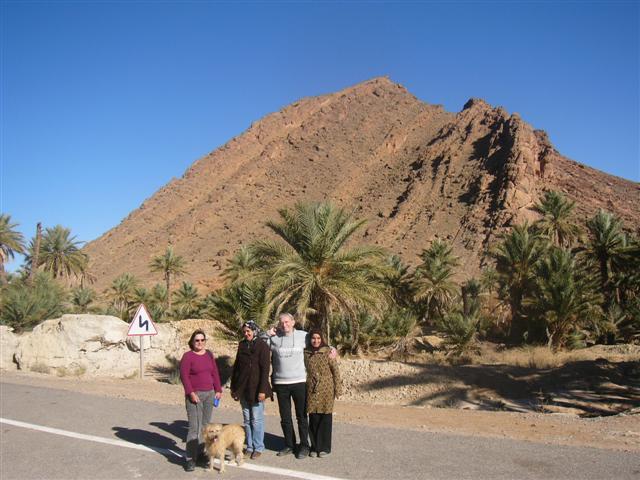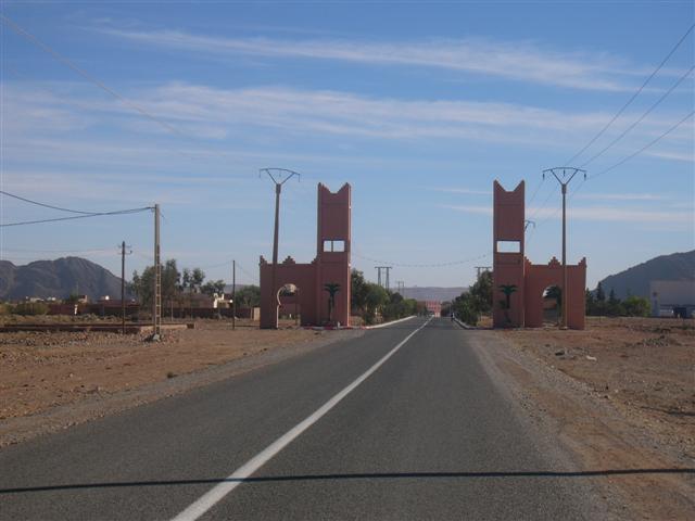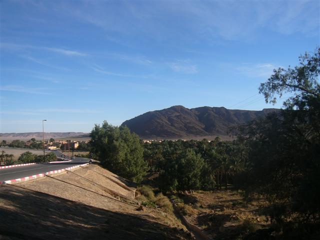 Der schwarze Punkt rechts verrät, in welchem Winkel am Ende der marokkanischen Welt wir uns jetzt befinden - in FIGUIG, ausgesprochen Figig. Auf einer Höhe von 860 bis 930 m von Bergen umgeben liegt diese grüne Perle der Wüste im äußersten Südosten von Marokko wie eine Enklave. Im Norden, Osten und Süden befindet sich algerisches Staatsgebiet und nur über die Nationalstraße 17 ist Figuig mit dem "Rest von Marokko" verbunden. Die Provinzhauptstadt Bouarfa ,110 km entfernt, ist die nächste Stadt. Nach der Erhebung von 2004 hat Figuig 12.577 Einwohner - und laut der Broschüre "Figuig - la perle du desert" 190.000 Dattelpalmen! Dieser Broschüre habe ich einige Formulierungen und Informationen über Figuig entnommen und in diesen Bericht eingefügt. 110 km nach der Allee in Bouarfa sehen wir die nächsten grünen Bäume, als wir uns dem Stadttor der Oasenstadt Figuig nähern.