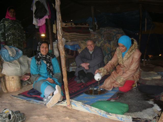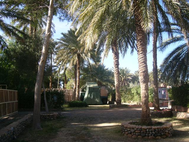 Dank der genauen Wegbeschreibung finden wir problemlos den Campingplatz am Hotel Figuig, auf dem es Stellplätze mit Stromanschluss für Wohnmobile zwischen den Olivenbäumen gibt. Durch Swimming-Pool und saubere Sanitäranlagen mit warmer Dusche auf Bestellung (Ofen muss angeheizt werden) vom "Olivenwald" getrennt gibt es den "Palmenwald" als Zeltplatz, der auch für Geländewagen (hier im Zelt "eingebaut") erreichbar ist. Links davon geht es zum Hotel mit Café und Restaurant. Ein warmes Essen muss 2 Stunden vorher bestellt werden. Nachdem wir das Ortszentrum durchquert und auf dem Campingplatz am Hotel Figuig eingecheckt haben, stellen wir erstaunt fest, dass es unterhalb des Platzes auch noch einen Ort gibt, teilweise hinter einem Wäldchen verborgen. Von verschiedenen Stellen des Platzes hat man schöne Ausblicke auf die unterhalb liegenden Ortsteile mit Palmengärten und auf die Berge, die dieses Oasental umgeben. Direkt unterhalb des Campingplatzes beginnen die Palmengärten - hier müsste man wohl eher von Palmenwäldern sprechen. Dank der ausreichenden Wassermengen, des fruchtbaren Bodens und des günstigen Klimas gibt es "drei Etagen" mit landwirtschaftlichen Kulturen: Weithin sichtbar sind die hohen Dattelpalmen - mit dem Kopf im Feuer und mit den Füßen im Wasser. Darunter in der mittleren Etage stehen die kleineren Bäume wie Oliven, Aprikosen, Feigen und Granatäpfel. Darunter überwiegend im Schatten der Bäume ist der Boden bedeckt mit Gemüse, Getreide, Kräutern usw. Hoch oben in den Gipfeln der Dattelpalmen wachsen die Früchte - und müssen hier geerntet werden. Nachdem wir uns von der Anreise etwas erholt haben, rufen wir Klaus (den Oasenrentner) an, mit dem wir vor der Abreise aus Deutschland per E-Mail Kontakt aufgenommen hatten. Kurze Zeit später kommt er mit seiner Frau Miluda zum Campingplatz. Natürlich sind wir sehr gespannt auf seine Lebensgeschichte, die ihn in diesen Ort am Ende der (marokkanischen) Welt geführt hat. Seit 1990 hat Klaus fast jährlich Motorradtouren durch Marokko gemacht. Dabei war er auch einige Male in Figuig und etwa im Jahr 2000 ist in ihm der Wunsch entstanden, in diesem schönen aber beschaulichen Ort fern vom Konsumstress in Deutschland seinen Lebensabend zu verbringen. "Hier in Figuig geht alles einen Gang langsamer als in der deutschen Hektik. Ich habe hier die Unbeschwertheit meiner Kindheit wiedergefunden.", erklärt Klaus seinen Umzug aus Deutschland nach Figuig. So hat er sich denn umgeschaut und letztlich zum Kauf eines Hauses im Rohbau entschieden, das dann nach seinen Vorstellungen ausgebaut wurde. 2001 hat er es bezogen und kurz danach haben er und Miluda sich kennen- und liebengelernt. Mit einer großen landestypischen dreitägigen Feier mit über 100 Gästen wurde 2002 geheiratet und seither leben beide in ihrem Häuschen in Figuig. Miluda hat zwar viele Verwandte in Figuig, den größten Teil ihres Lebens aber in Meknes gelebt - der Umzug auch für sie also eine Umstellung.